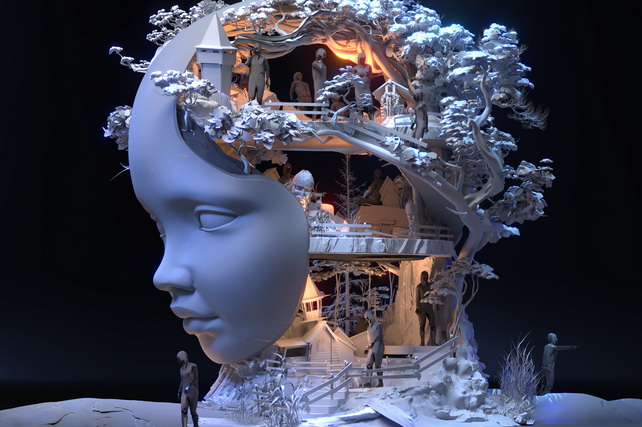 Центральный сценографический образ — десятиметровая человеческая голова, внутри которой с помощью видеомэппинга разворачиваются фантастические миры. Режиссёр спектакля — Илья Устьянцев, художник по костюмам — Сергей Новиков. Художник-сценограф — Александр Кудрявцев.