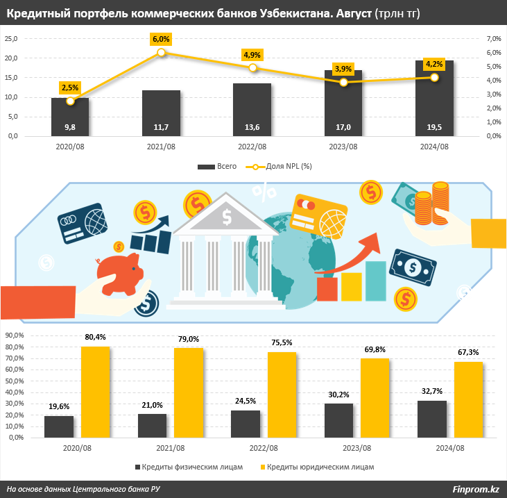 Ташкент, Узбекистан (UzDaily.uz) — Кредитный портфель коммерческих банков Узбекистана на конец августа текущего года достиг 509,7 трлн сумов (19,5 трлн тг*) — на 14,6% больше, чем годом ранее. Из них объём проблемных кредитов составил 822,5 млрд в тенговом эквиваленте (далее мы все данные будем переводить в тенге для удобства читателей) — на 24,7% больше, чем в августе прошлого года. Доля NPL от ссудного портфеля БВУ РУ за год выросла с 3,9% до 4,2%.